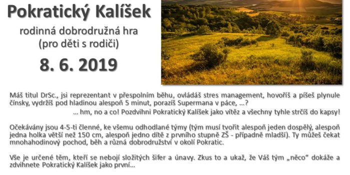 Pokud se na Kalíšek těšíte a máte chuť se Hry zúčastnit, stačí se na stráknách PK přihlásit – když si projdete pravidla, omrknete příspěvky na nástěnce, určitě budete vědět vše potřebné, abyste se se svým týme mohli 8.6. dostavit na start a pokusit se zvítězit.